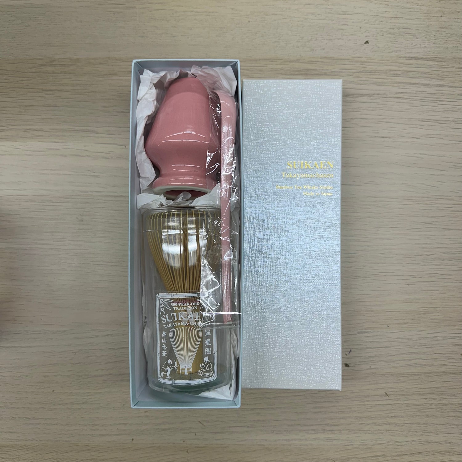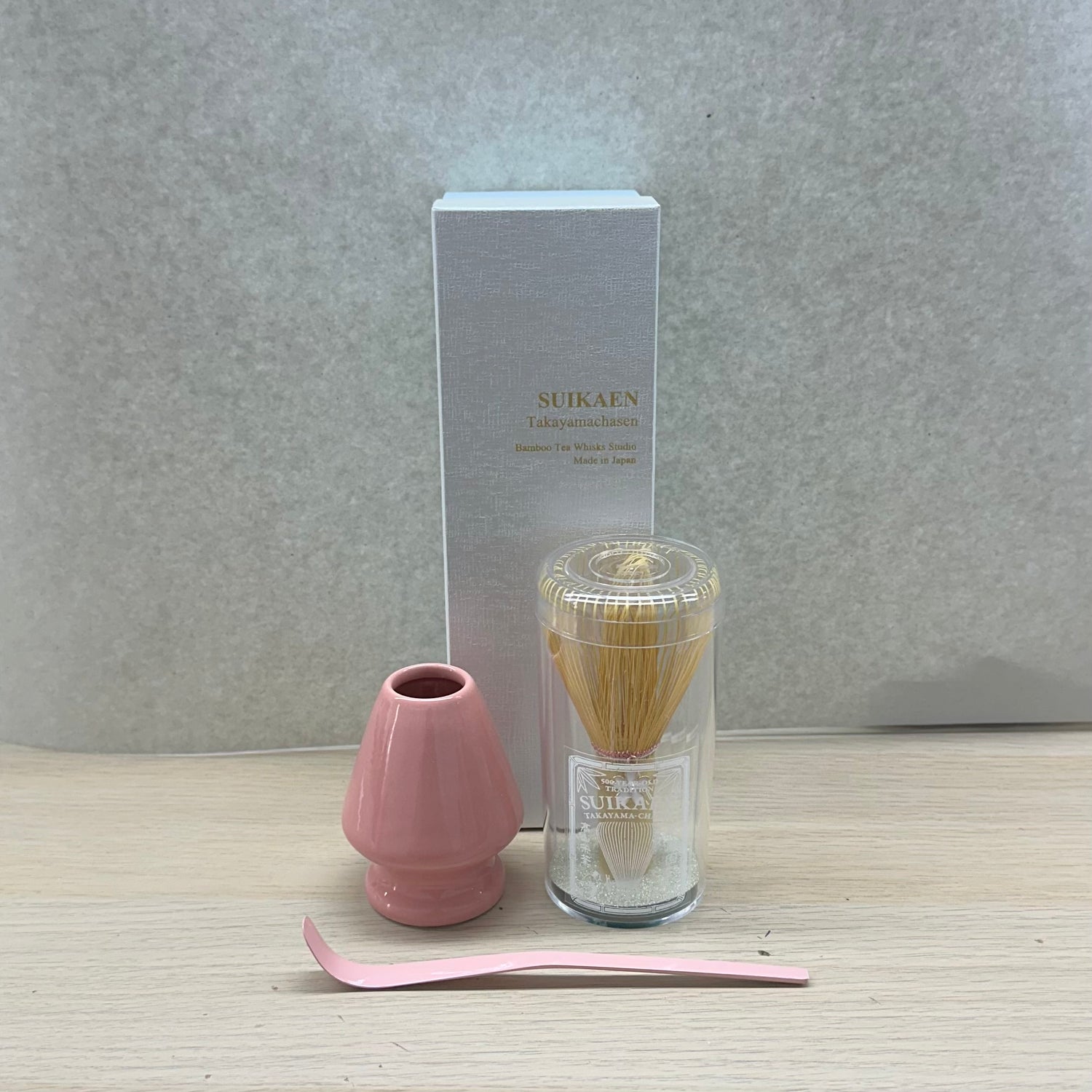 Suikaen: Chasen Matcha Whisk, Laughter (Pink Emi, 笑) - Emi Pink Set - Whisk / Whisk stand / Urushi lacquer coated tea scoop <-- Procured or produced on demand. PREORDER now to get started.