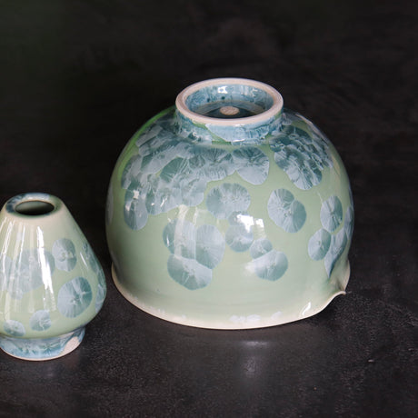 Kiwakoto Suikaen Green Matcha Pouring Bowl & Whisk Stand Set 片口抹茶碗と茶筅直しセット みどり