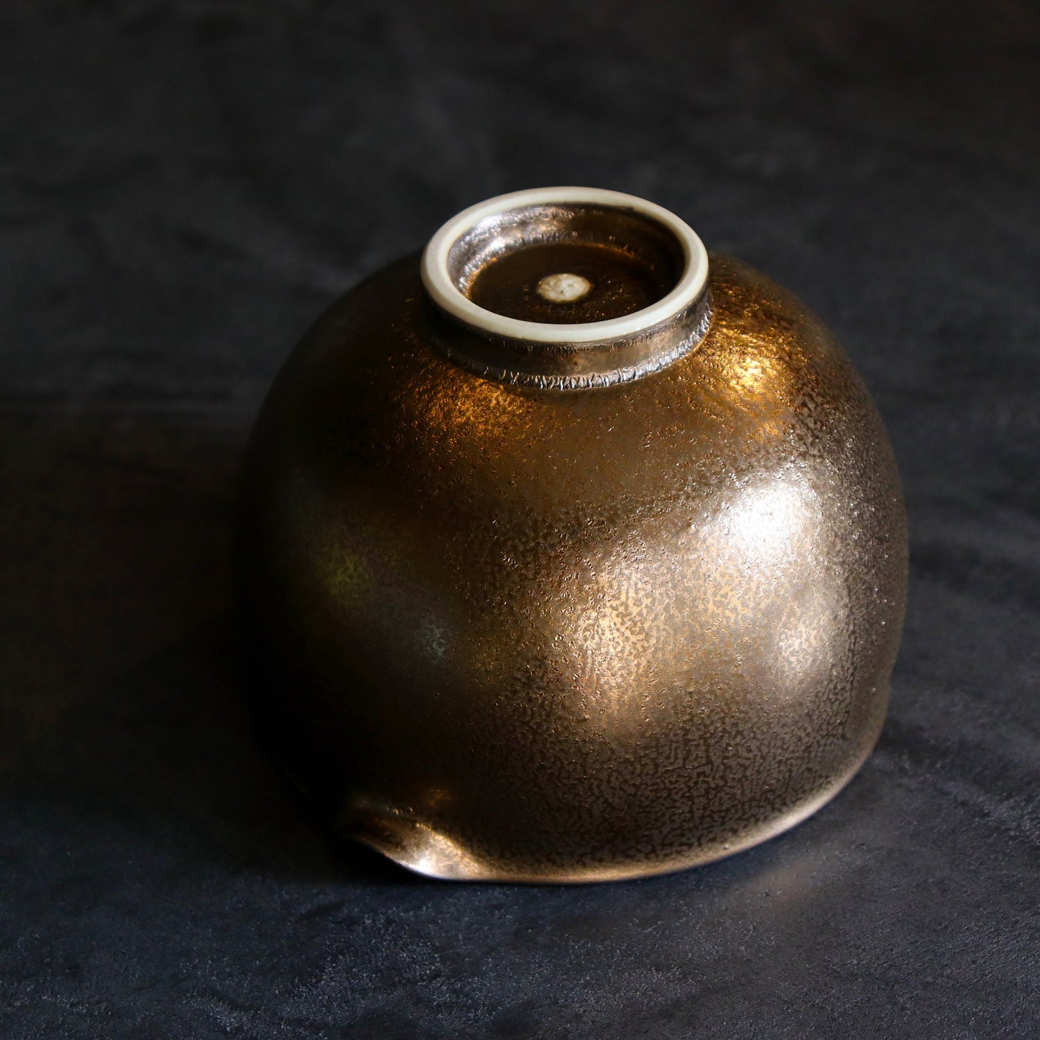 This refined matcha set includes a katakuchi-style pouring matcha bowl and a whisk stand  both finished in a soft, muted gold glaze. Rather than shining boldly, the surface reveals a gentle, understated glow—quiet, composed, and deeply sophisticated.